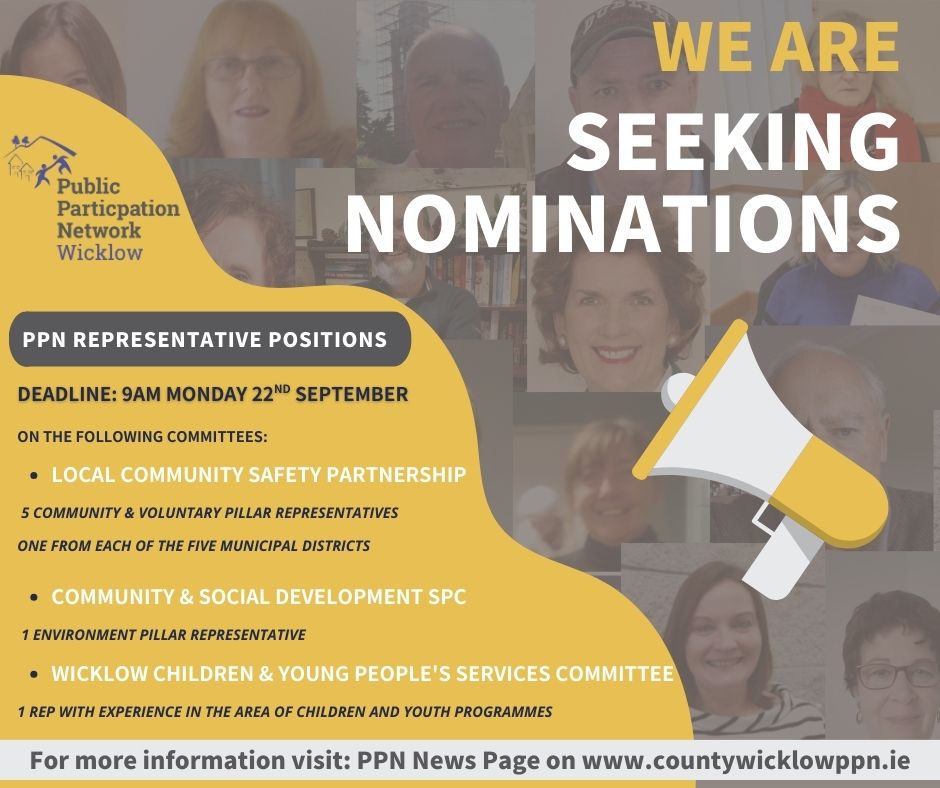 Wicklow PPN currently has a number of vacant Representative seats, including on the newly forming Wicklow Local Community Safety Partnership Committee, that we would encourage people to consider putting their names forward for.